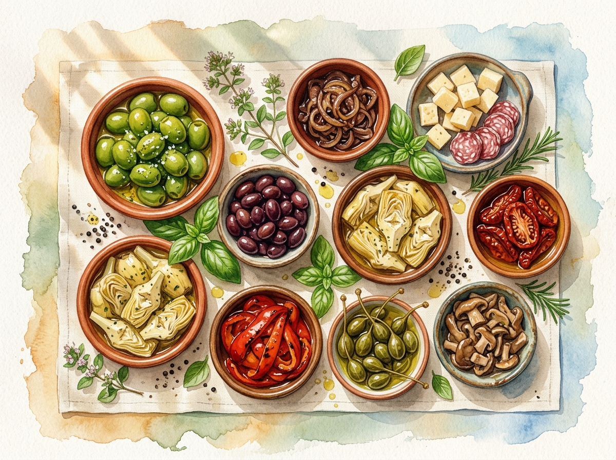 Sonnengereifte Oliven, eingelegtes Gemüse, sonnengetrocknete Tomaten – frisch aufgelegt.