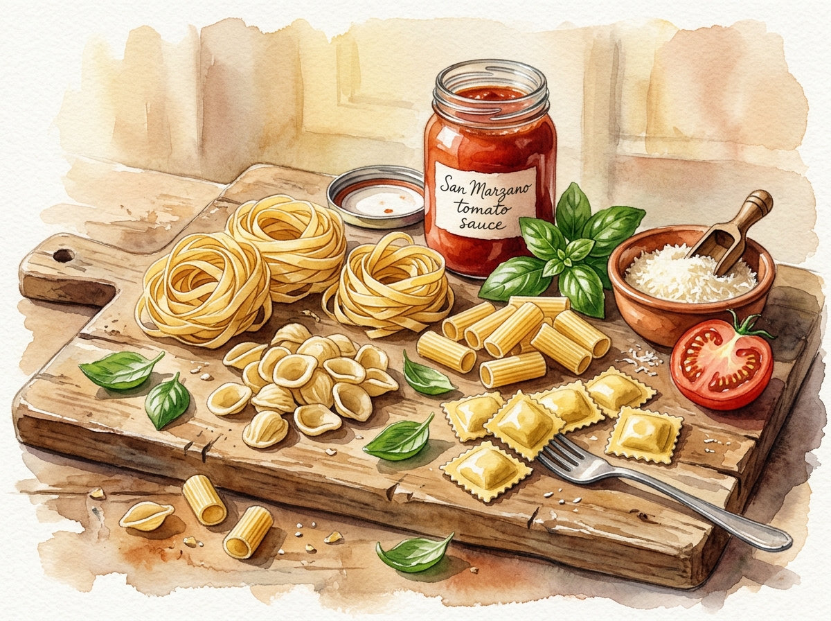Handgemachte Pasta, Tortellini, Sugo aus San-Marzano-Tomaten und Pestos aus Ligurien.